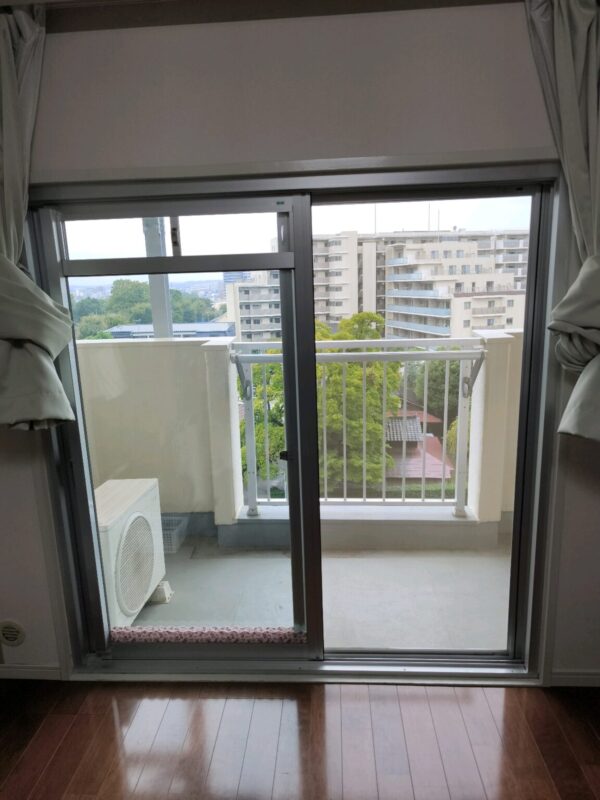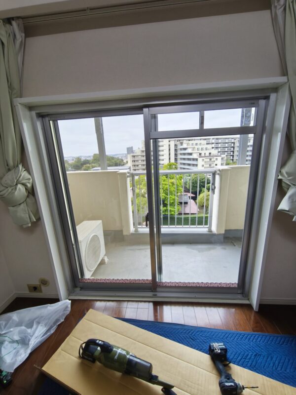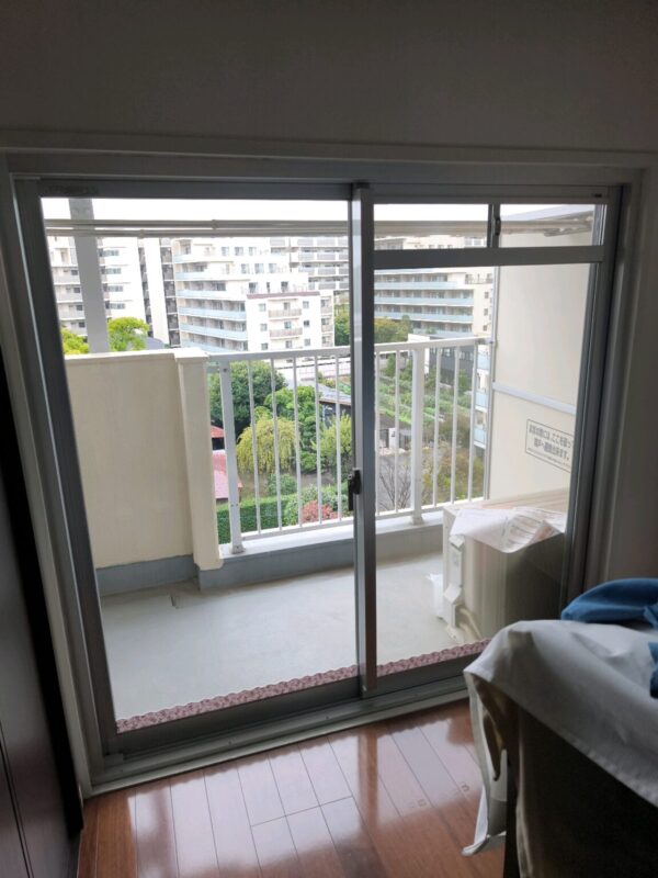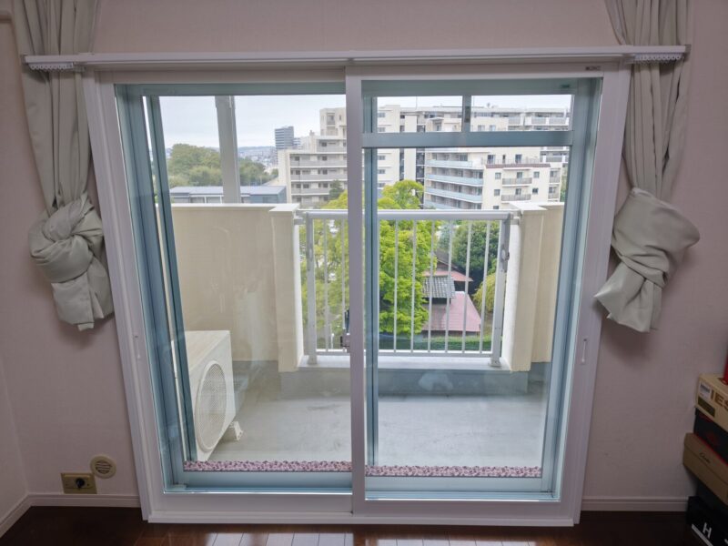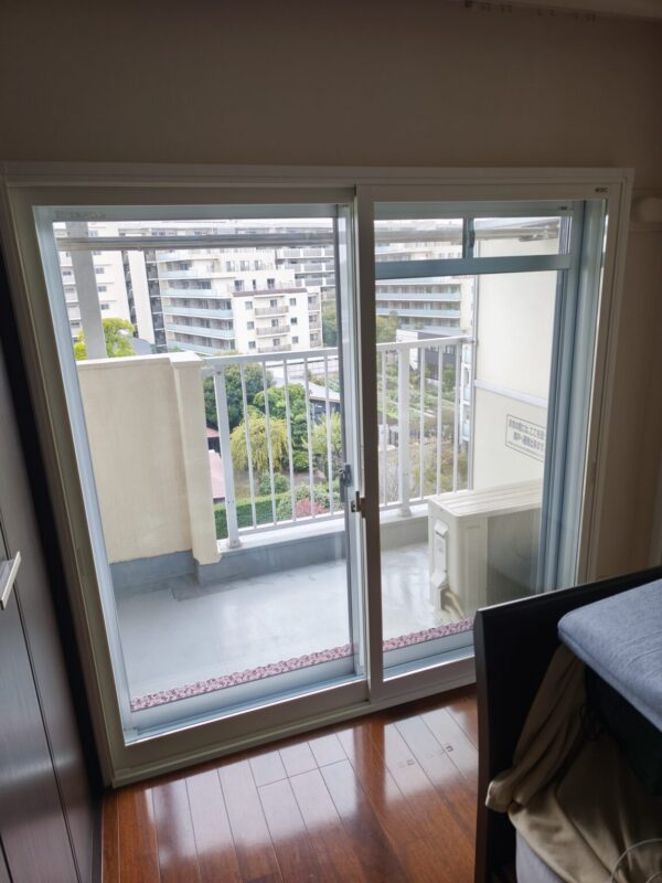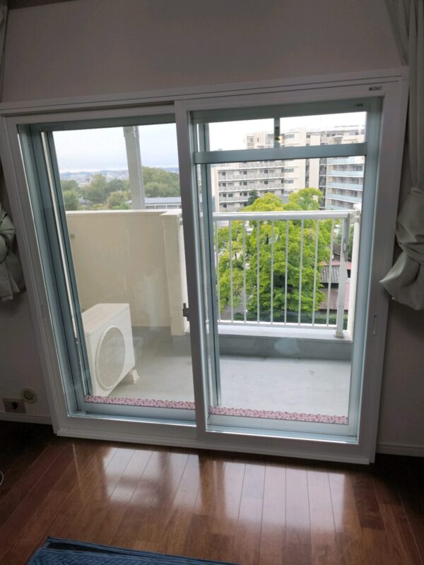 調布市仙川の築53年分譲マンションにお住まいのお客さま宅で、バルコニー側掃出し窓2箇所に70mm3方ふかし枠を設置後にLIXILの内窓「インプラス」のLow-Eグリーンガラス仕様を設置させていただいた施工例をご紹介いたします。