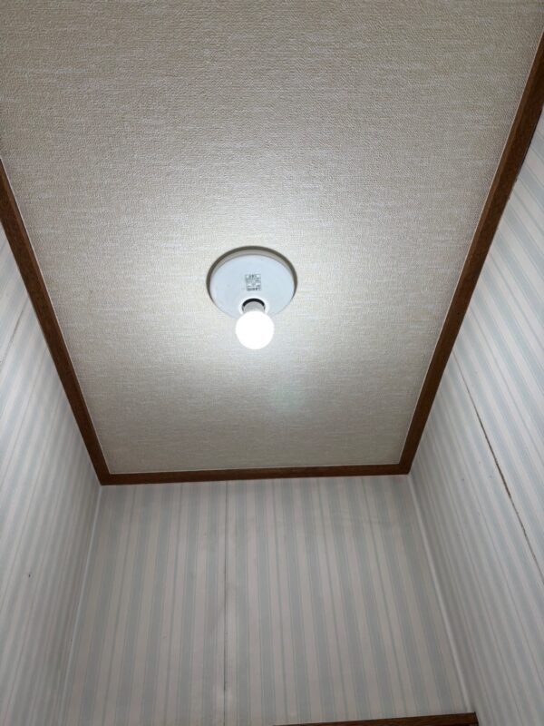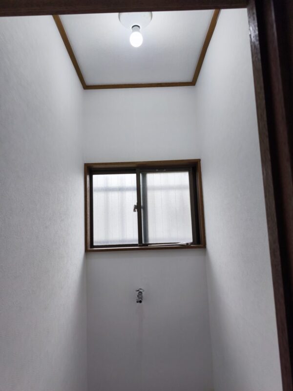 床下地は比較的しっかりしていたので、12mmベニヤ板を上貼りしてからクッションフロアを貼ってトイレを設置するのと、併せて壁天井クロスとタオル掛け・ペーパーホルダーも交換する形でご提案したところ、ご納得いただけたので施工させていただきました。