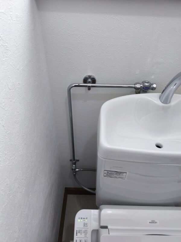 既設が隅付タンクでしたので、給水管が出ている位置がピュアレストQRのタンクの裏になってしまうので、隅付タンク取替用止水栓で給水管を左下に延長して便器・タンクとウォシュレットを設置しました。
